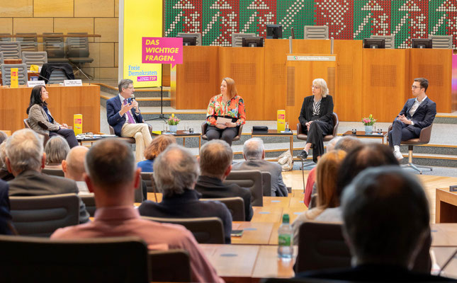 Unter der Moderation von Franziska Müller-Rech, MdL, tauschten Professor Paqué, Anita Rick-Blunk, Vorstandsmitglied der Liberalen Senioren, JuLi-Vorsitzender Alexander Steffen und Susanne Schneider, MdL, Sprecherin Arbeit, Gesundheit und Soziales ihre generationenbezogenen Argumente dazu aus. Auch zahlreiche Fragen vom Publikum zu Altersdiskriminierung, Bürokratieabbau, Bürgergeld, Bezahlbarer Wohnraum und Verhinderung der AfD wurden von den Diskussionsteilnehmern beantwortet.